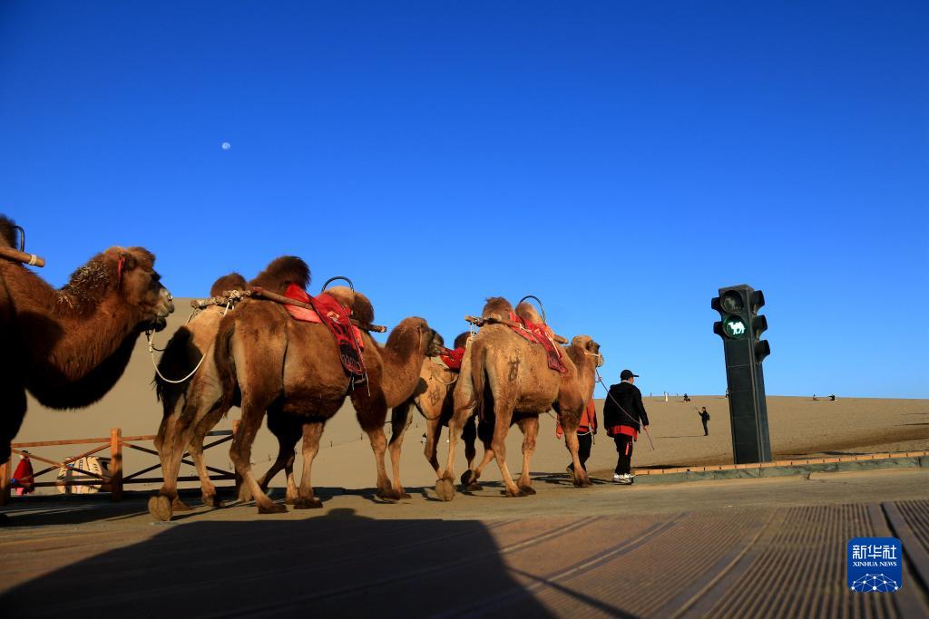 10月2日,甘肅省敦煌市鳴沙山月牙泉景區的交通信號燈“駱駝綠燈”亮時,農戶牽著駱駝有序通過。