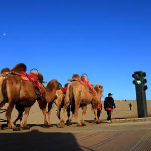 甘肅敦煌:景區旅游迎高峰 駱駝紅綠燈暢交通
