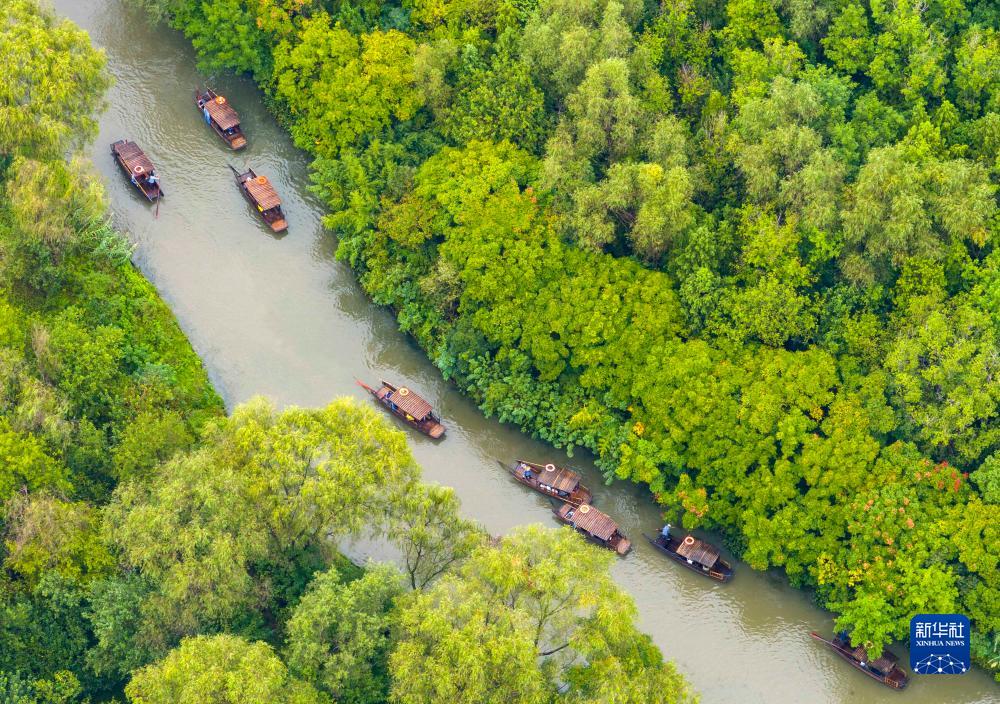 10月3日,游人在江蘇省泰州市姜堰區溱湖國家濕地公園乘搖櫓船游覽(無人機照片)。
