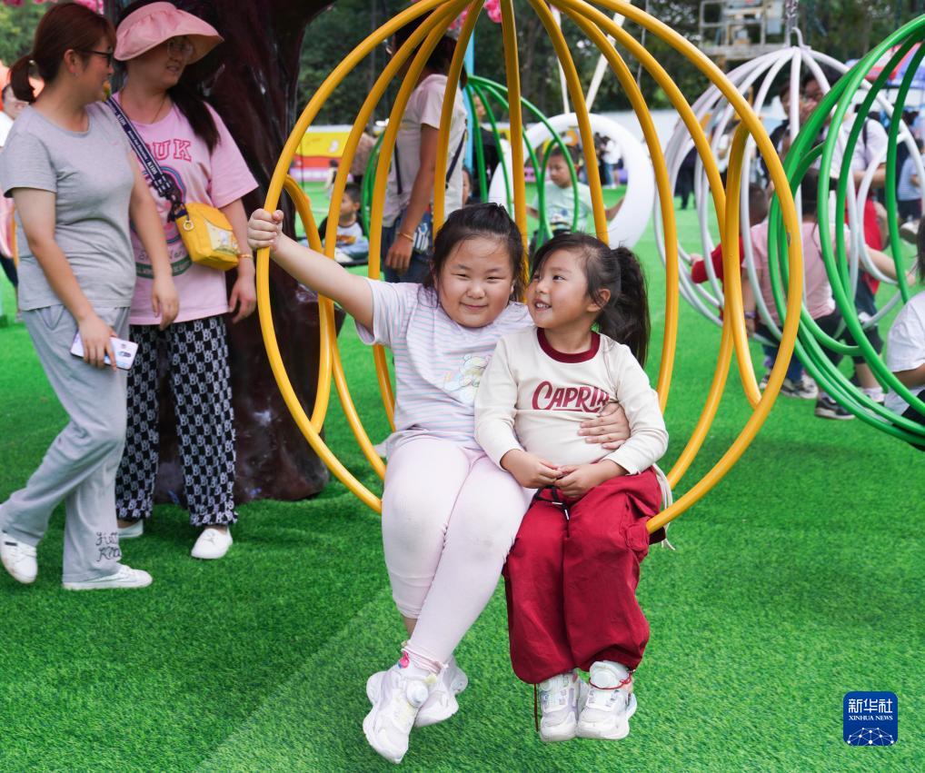 10月3日,孩子們在山東省鄒平市一家游樂園游玩。