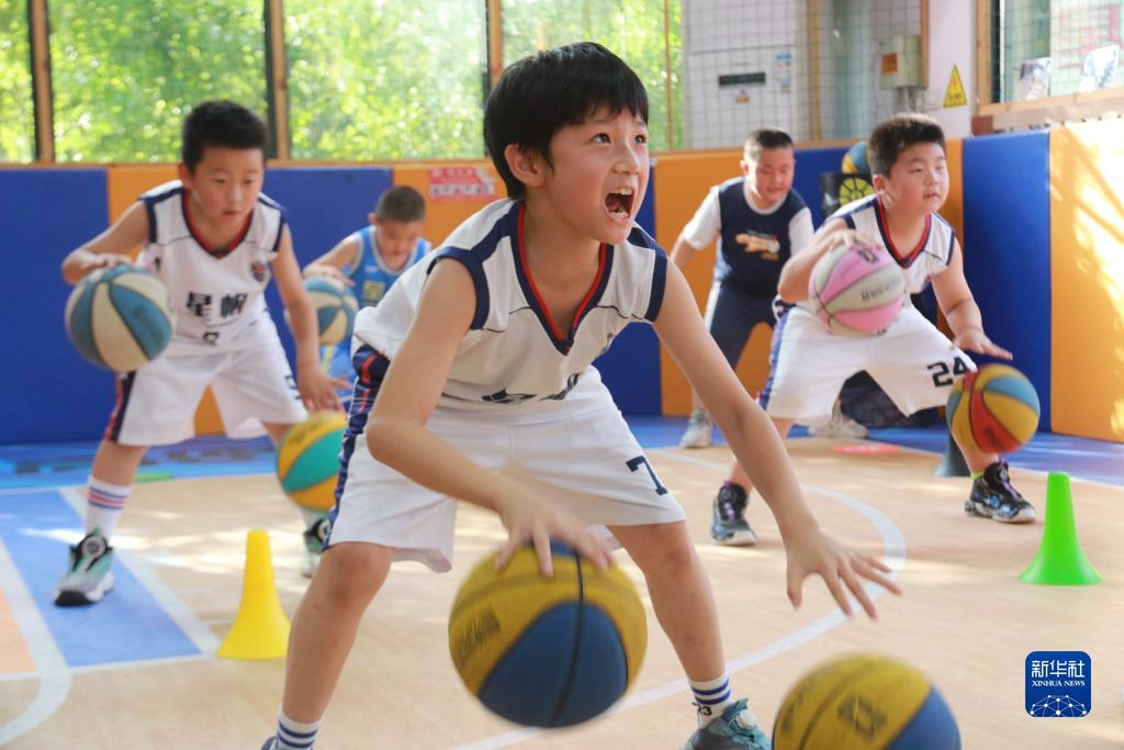 10月2日,孩子們在山東省高密市一籃球訓練營進行籃球基本功訓練。