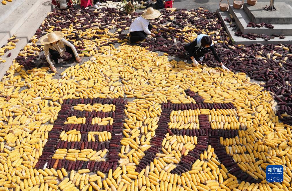 10月4日,在北京市平谷區平谷鎮北臺頭村村委會,村民在晾曬玉米。