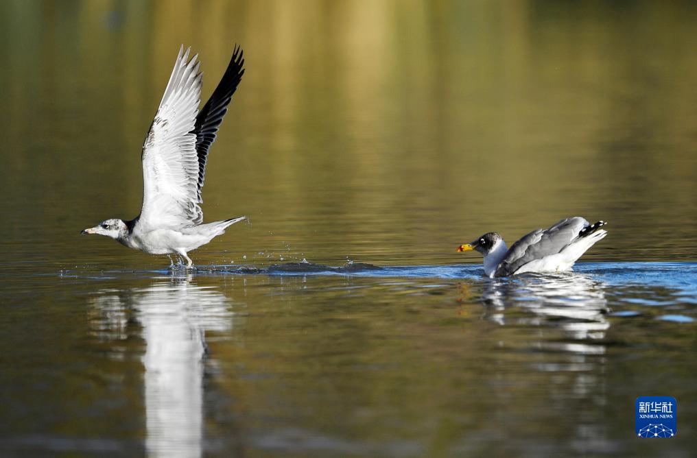 金秋十月,漁鷗在西藏拉薩市國家級自然保護區拉魯濕地里嬉戲,惹人喜愛。