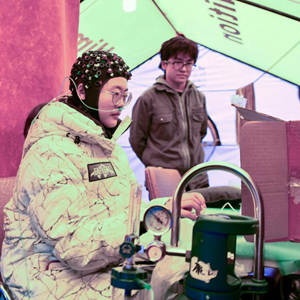 在卓奧友峰登山大本營,科考隊員(前)佩戴全腦彈性測試帽,測試有氧和無氧狀態下的人體認知能力(9月29日攝)。