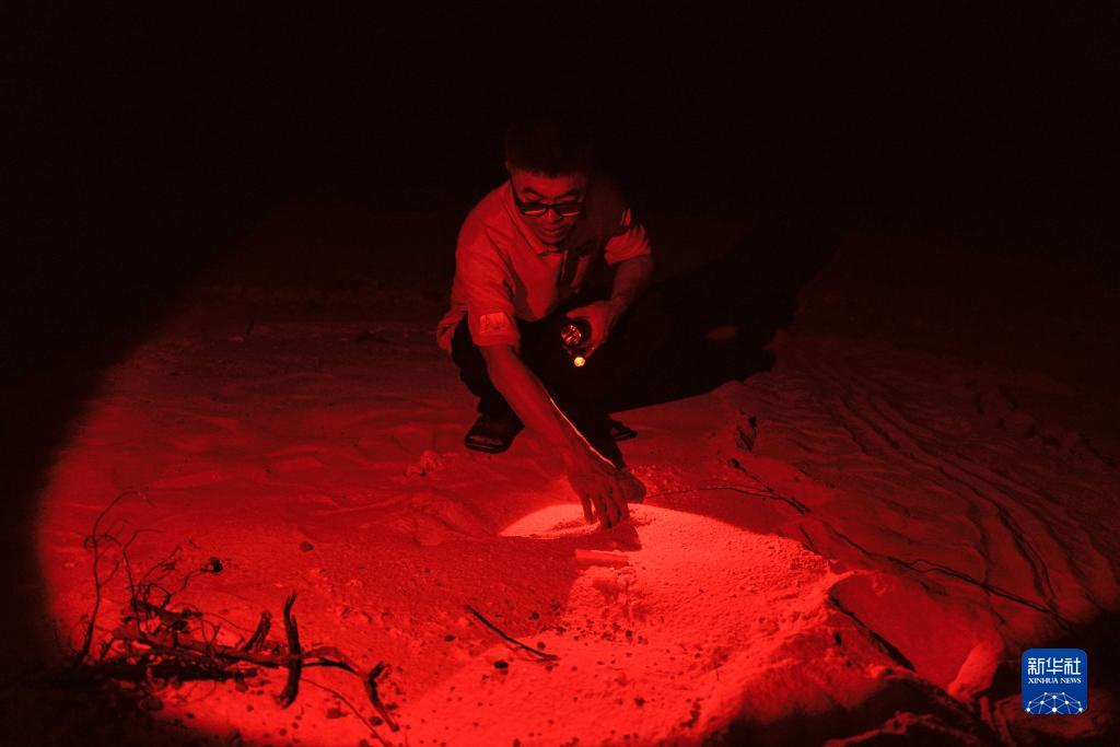 9月28日,黃程在夜晚觀察到海龜上岸產卵,查看海龜足跡。