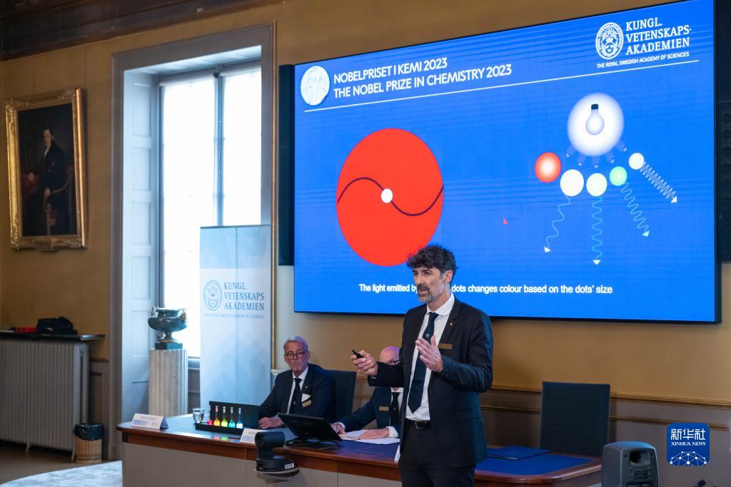 10月4日,在瑞典斯德哥爾摩的2023年諾貝爾化學獎公布現場,評委會專家解讀今年諾貝爾化學獎得主的研究成果。