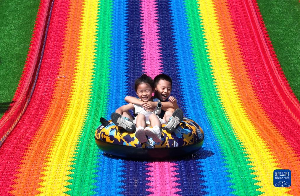10月4日,小朋友在江蘇省揚州市茱萸灣風景區體驗七彩滑道游樂項目(無人機照片)。