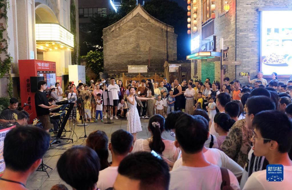 10月4日,消費者在廣西南寧市三街兩巷觀看演出。