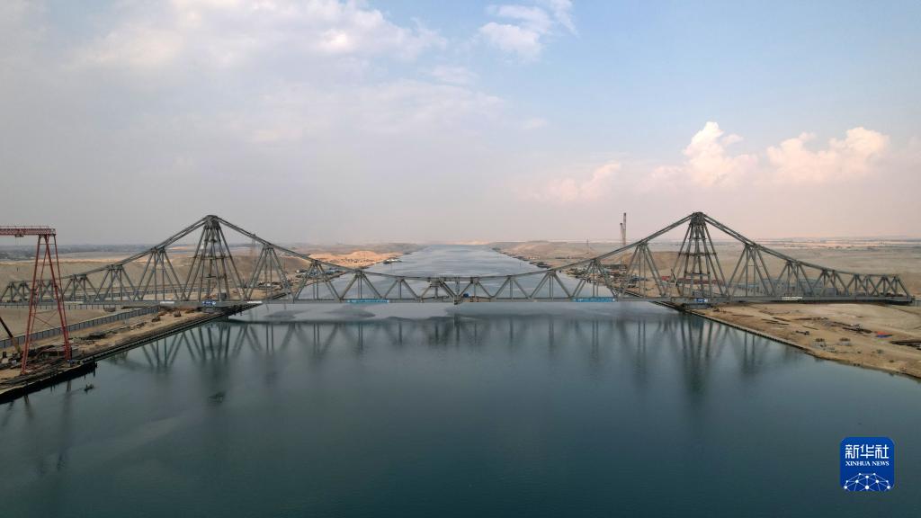 這是2021年11月17日在埃及伊斯梅利亞省拍攝的蘇伊士運河鐵路橋舊橋改造升級項目施工現場(無人機照片)。蘇伊士運河鐵路橋連接非、亞大陸。