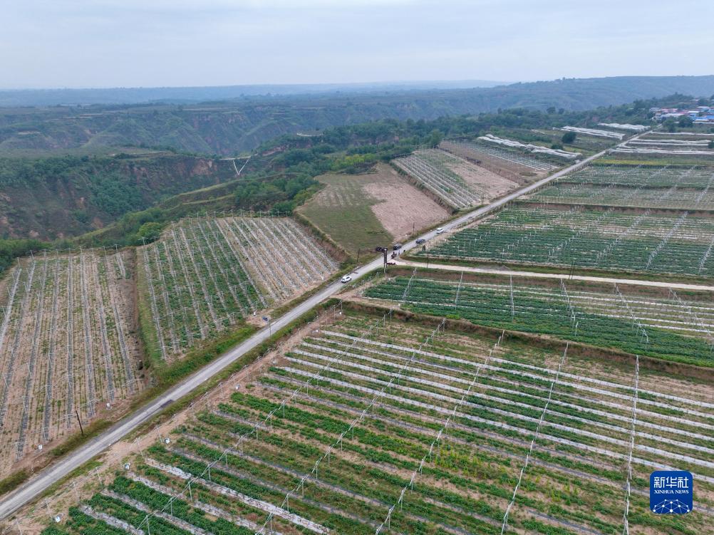 宜川縣云巖鎮北赤村完成新品種改造的蘋果園(9月27日攝,無人機照片)。