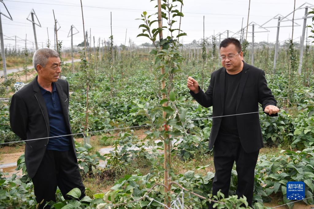 在宜川縣云巖鎮北赤村完成新品種改造的蘋果園內,縣農業部門的技術干部在為果農講解生產注意事項(9月27日攝)。