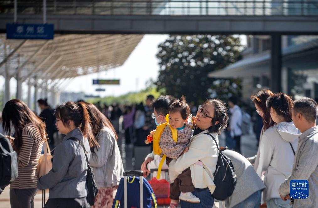10月5日,旅客在江蘇泰州站站臺排隊候車。