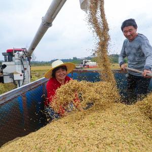 10月5日,在河南省信陽市光山縣羅陳鄉張樓村,一家合作社社員在搶收水稻。