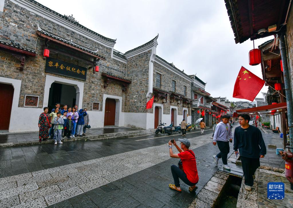10月5日,游客在貴州省黎平縣黎平會議紀念館前留影。