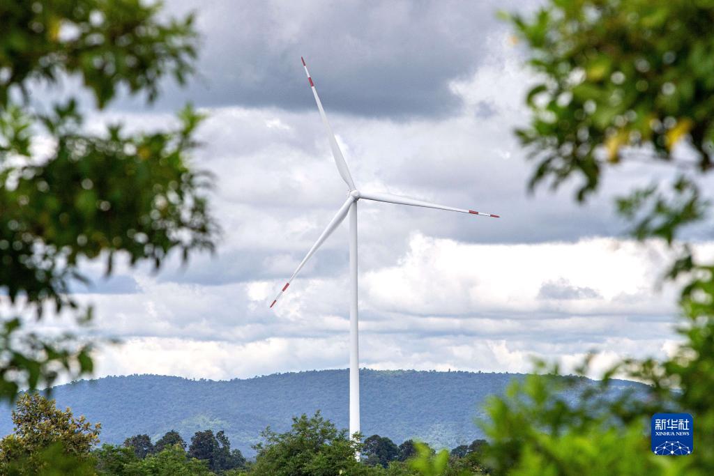 這是10月5日在泰國猜也蓬府拍攝的由中國金風科技提供的風力發電機。