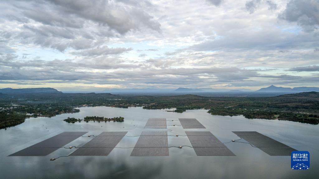 這是2022年12月8日在泰國烏汶府詩琳通水庫拍攝的浮體光伏項目(無人機照片)。據介紹,該項目共安裝光伏組件14.4萬余片,總裝機容量58.5兆瓦,每年可以減少4.7萬噸二氧化碳排放,助力泰國減少對高污染火力發電的依賴。