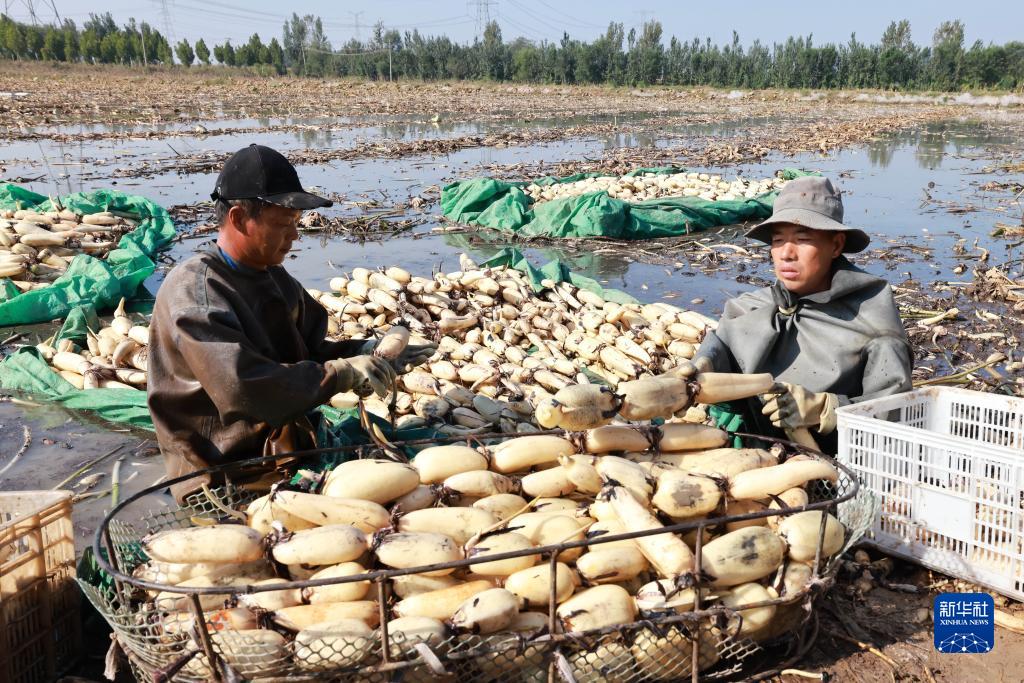 10月5日,河北省新河縣西流鄉西董村一家蓮藕種植合作社的社員在分揀收獲的蓮藕。