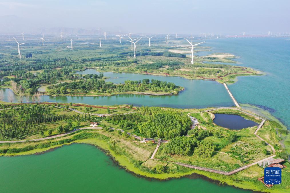 這是2021年7月8日拍攝的河北省懷來縣官廳水庫國家濕地公園景色(無人機照片)。近年來,懷來縣不斷加強官廳水庫生態濕地保護與修復工程,官廳水庫及上游永定河流域的生態環境明顯改善。