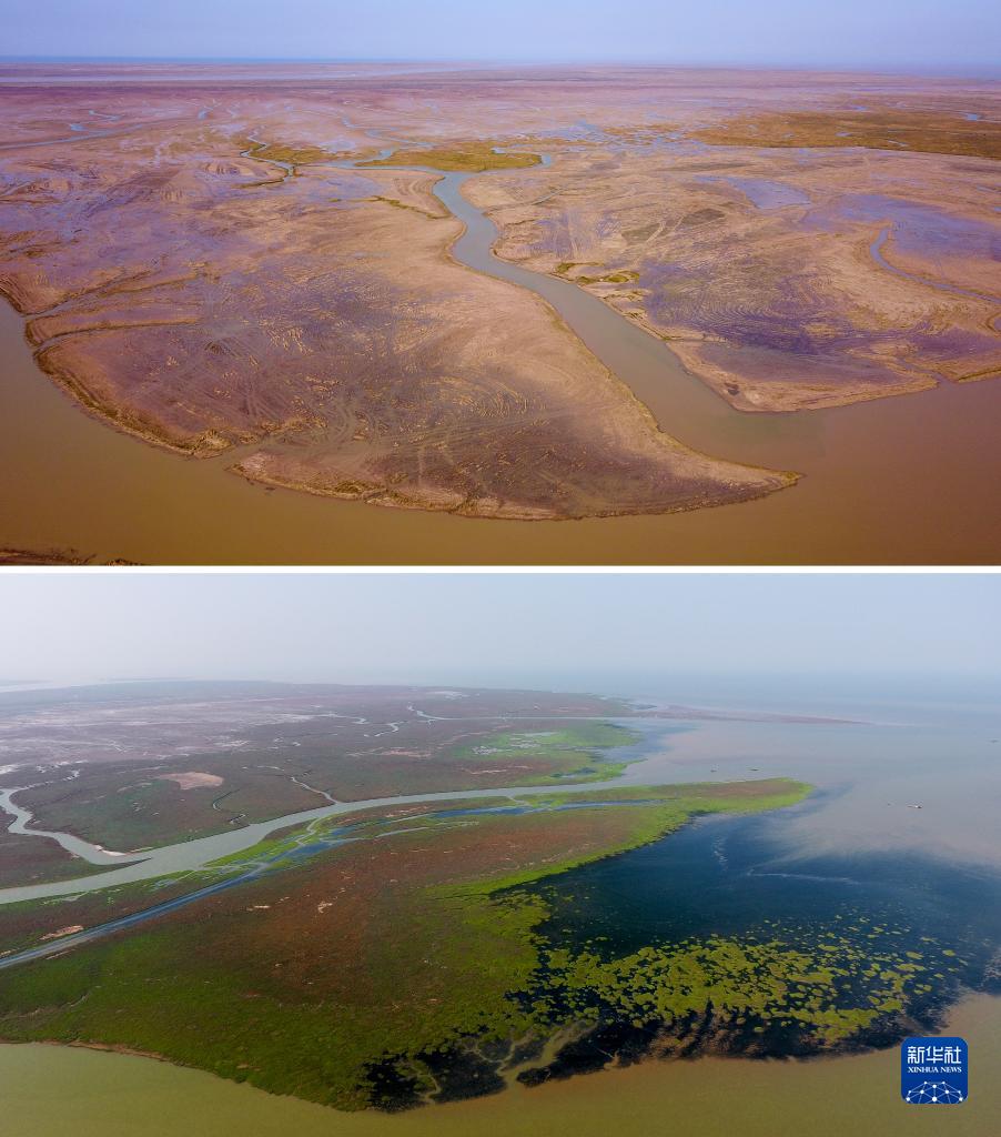 這是一張拼版照片:上圖為2018年6月23日拍攝的山東黃河三角洲國家級自然保護區互花米草未治理時的畫面;下圖為2021年10月27日拍攝的山東黃河三角洲國家級自然保護區互花米草治理后的畫面(無人機照片)。近年來,保護區實施黃河三角洲濕地生態系統修復工程,開展退耕還濕、退養還灘,推進河口濕地自然修復和河湖生態聯通,有效恢復了濕地功能,提高了生物多樣性。