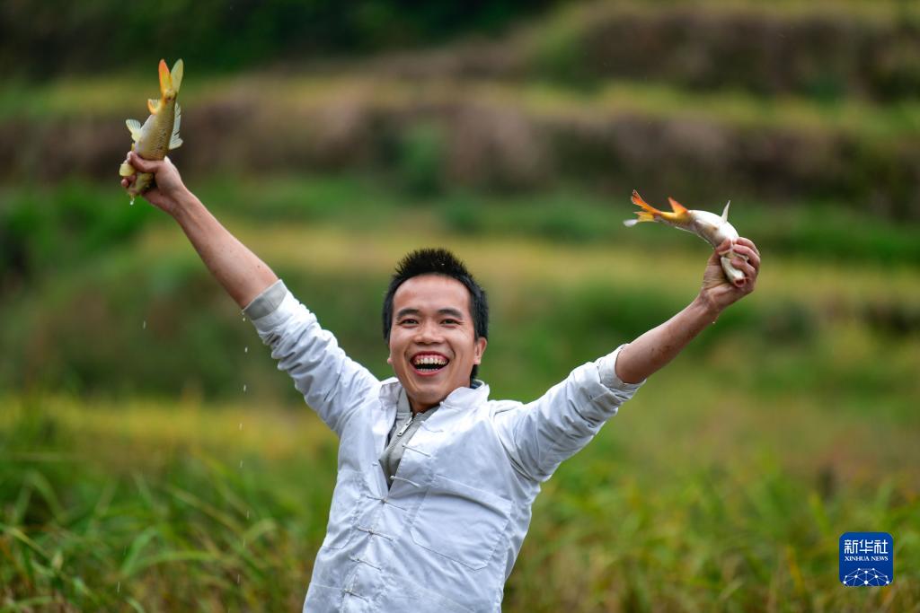 10月5日,貴州省黎平縣雙江鎮黃崗村的年輕人在展示稻田里養殖的魚。