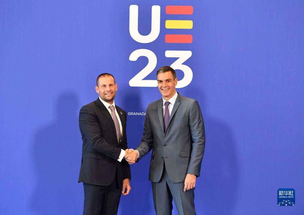 10月6日,在西班牙南部城市格拉納達,前來參加歐盟領導人非正式會議的馬耳他總理阿貝拉(左)與西班牙代理首相桑切斯致意。