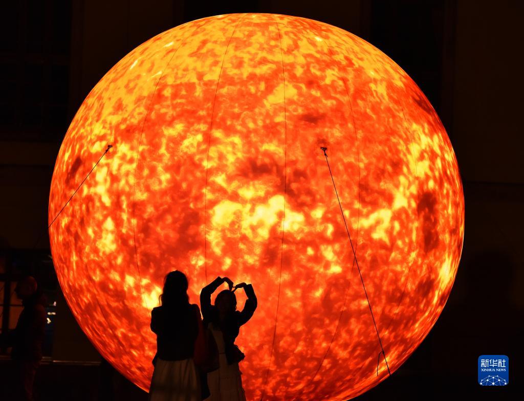 10月6日,在德國柏林,游客站在洪堡大學內的裝置藝術品前。