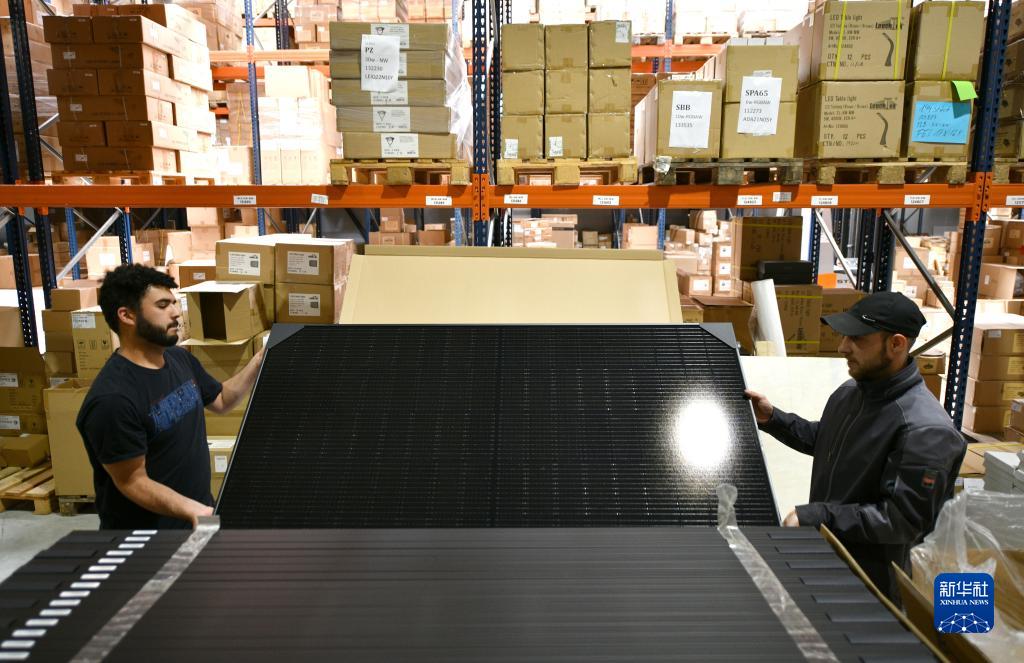 在位于德國阿倫斯堡的產品經銷商勞克斯新能源有限公司,工作人員打包中國產太陽能發電板,準備送往客戶迪爾克家(5月30日攝)。