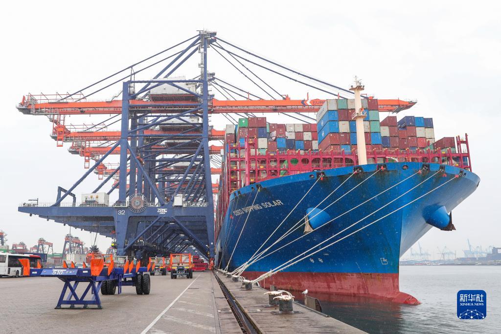 一艘中遠海運集團貨輪??吭诤商m鹿特丹港(5月1日攝)。據了解,迪爾克家安裝的中國產太陽能設備經海路到達荷蘭鹿特丹港后轉運至德國。