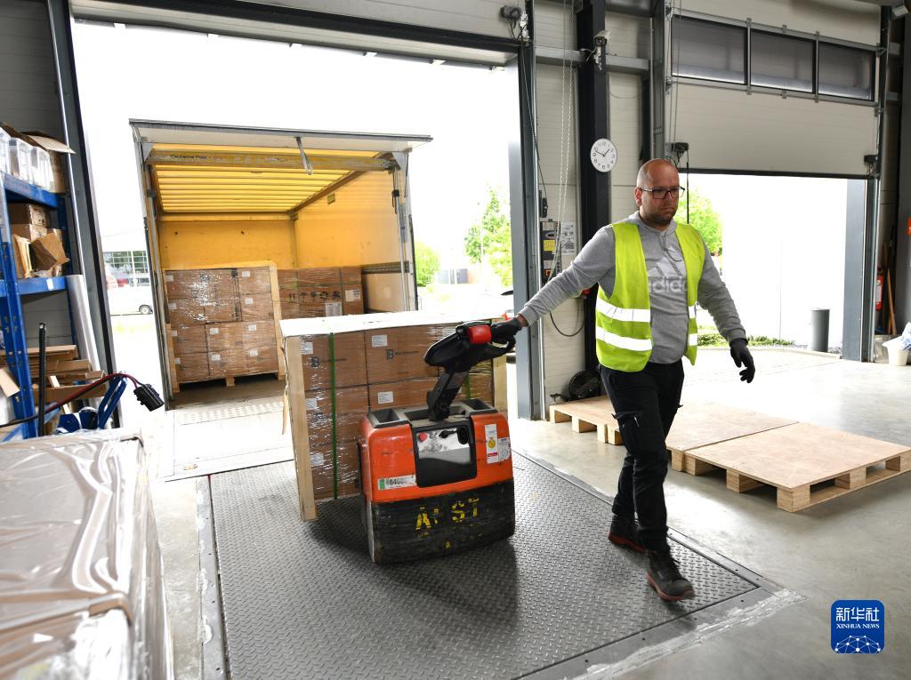 在位于德國阿倫斯堡的產品經銷商勞克斯新能源有限公司,工作人員卸載中國產微型逆變器產品(5月30日攝)。