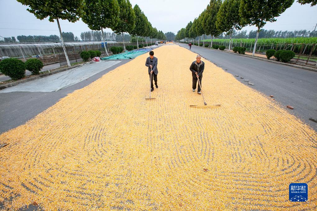 10月7日,在河南省焦作市博愛縣清化鎮街道太子莊村,村民晾曬剛收獲的玉米。