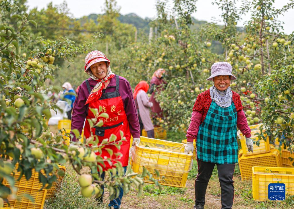 10月7日,在山東省榮成市俚島鎮花園谷一處蘋果園內,果農在采摘、分揀、裝運蘋果。