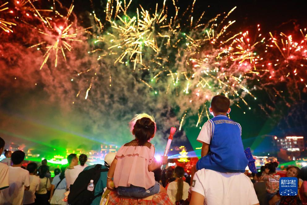 10月1日,游客在貴州省黔東南苗族侗族自治州凱里市下司古鎮觀賞煙花。