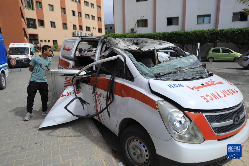 這是10月7日在加沙地帶城市汗尤尼斯拍攝的在以色列空襲中受損的救護車。