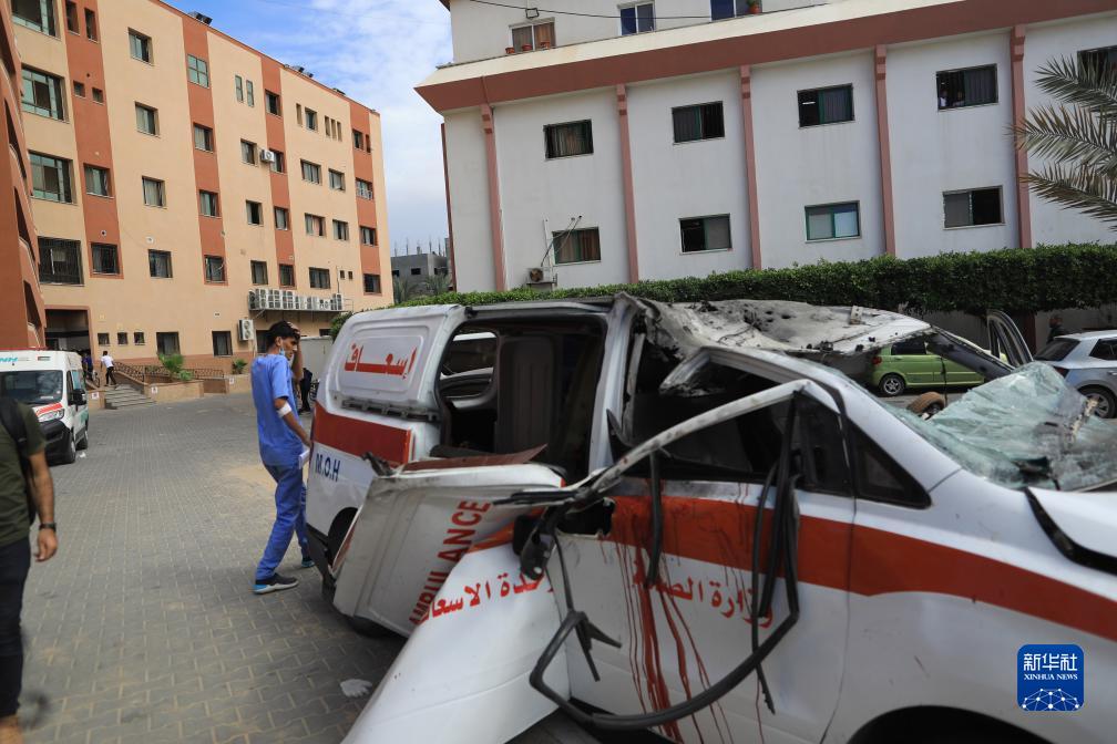 這是10月7日在加沙地帶城市汗尤尼斯拍攝的在以色列空襲中受損的救護車。
