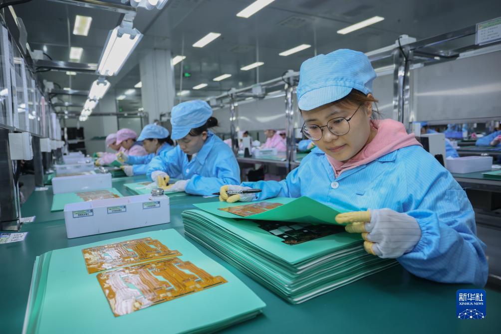 10月7日,工人在四川省遂寧市高新區一家電子企業的生產線上作業。