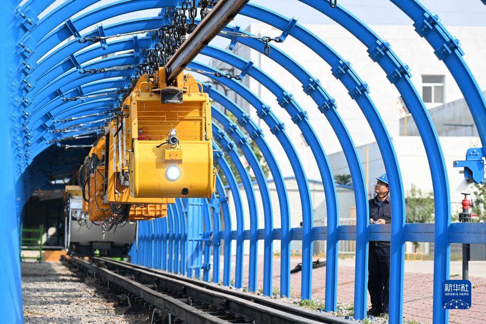 10月7日,工人在石家莊裝備制造產業園石煤機公司調試無人駕駛鋰電單軌吊。