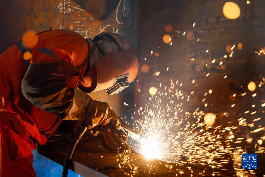 10月7日,工人在海油工程天津智能化制造基地結構預制車間進行焊接作業。