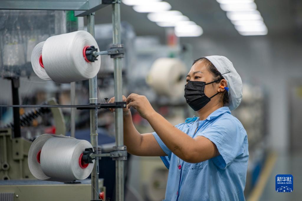 10月7日,工人在位于浙江省蘭溪市的浙江金梭紡織有限公司牛仔面料自動化生產線旁巡檢。