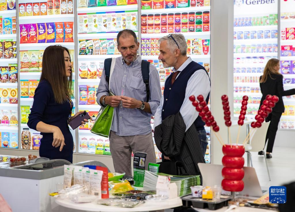 10月7日,人們在德國科隆國際食品博覽會的一個中國企業展臺參觀交談。新華社記者 張帆 攝