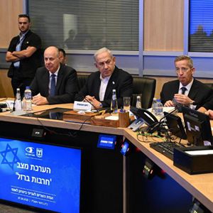 10月7日,以色列總理內塔尼亞胡(前排右五)出席在特拉維夫舉行的安全內閣會議。