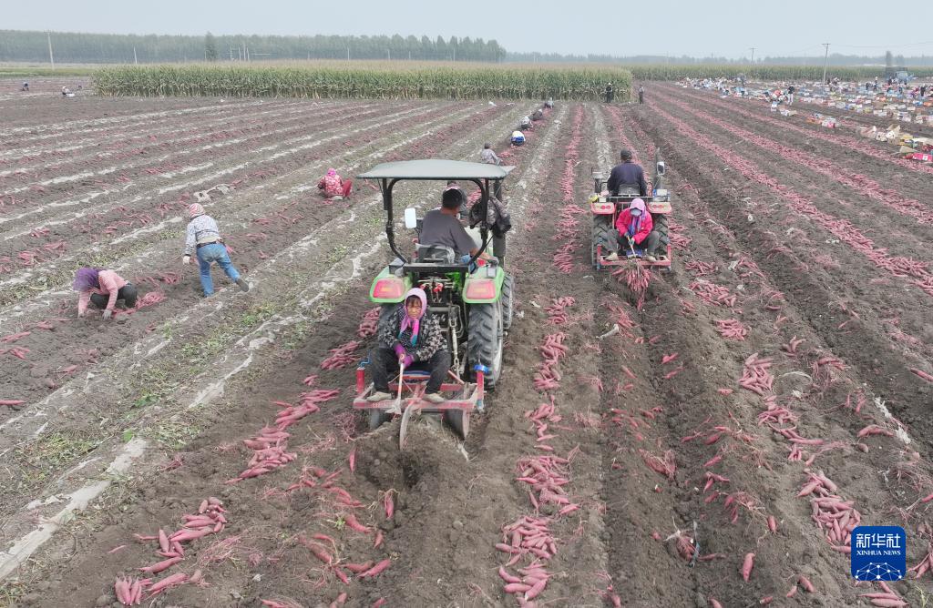 10月7日,河北省唐山市豐潤區小張各莊鎮南青坨村一家紅薯種植合作社的社員在田間收獲蜜薯(無人機照片)。