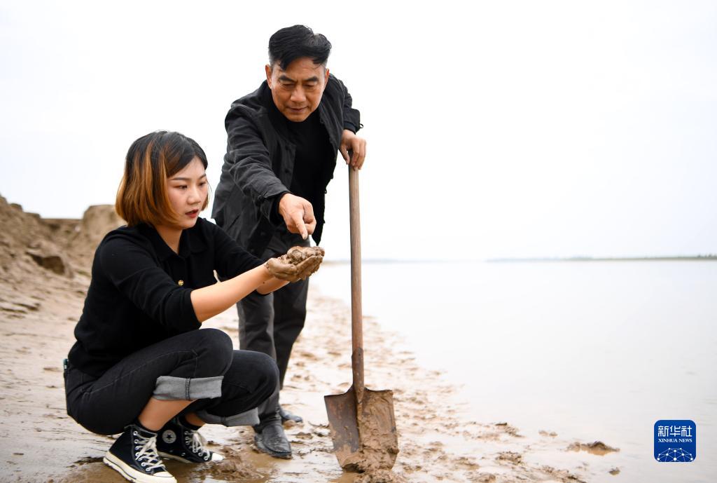 10月7日,在黃河河南洛陽段,游曉曉(左)捧起黃河泥,觀察泥土細膩度。