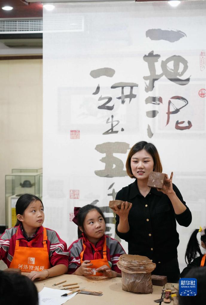 10月7日,在河南省洛陽市新安縣河洛澄泥硯藝術館,游曉曉在教小學生制作澄泥硯。