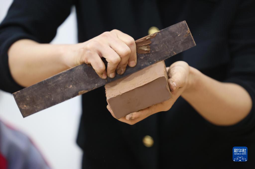 10月7日,在河南省洛陽市新安縣河洛澄泥硯藝術館,游曉曉在教小學生刮平整形泥坯。