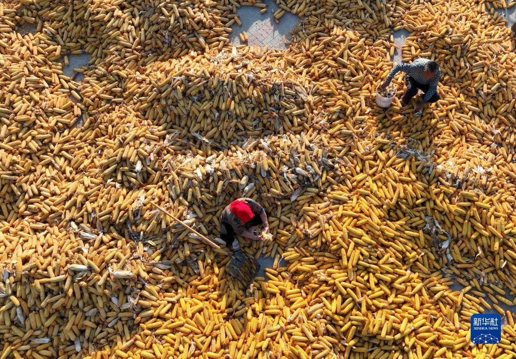 10月4日,河北唐山豐南區唐坊鎮孔家莊村的農民在剝玉米皮(無人機照片)。