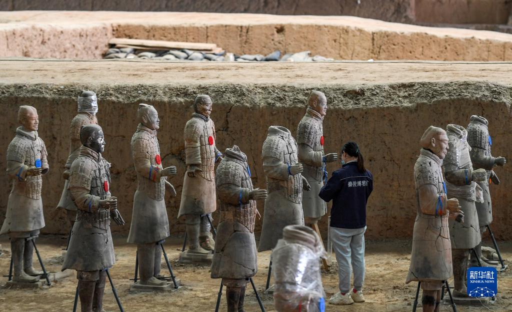 工作人員在秦兵馬俑一號坑遺址進行秦俑修復(4月26日攝)。