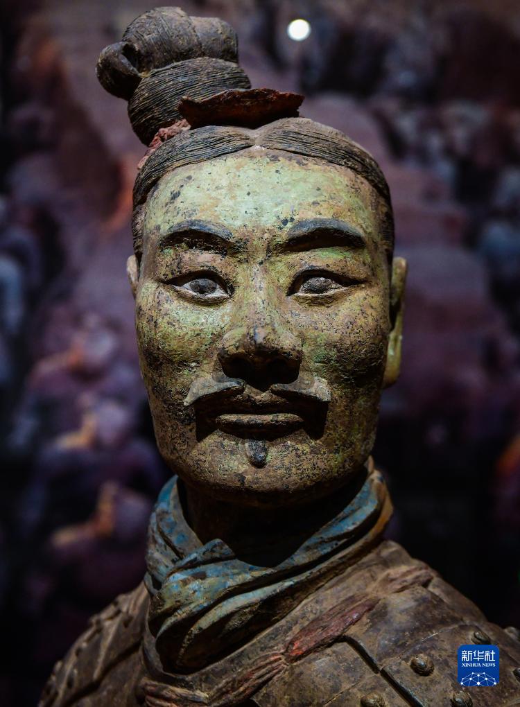 這是彩繪綠面跪射俑頭部細節(2021年5月18日攝)。