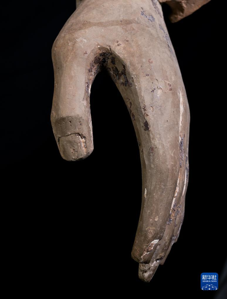 在秦始皇帝陵博物院文物保護部彩色陶俑修復室內,一尊秦俑的手部特寫顯示出豐富的細節(8月23日攝)。