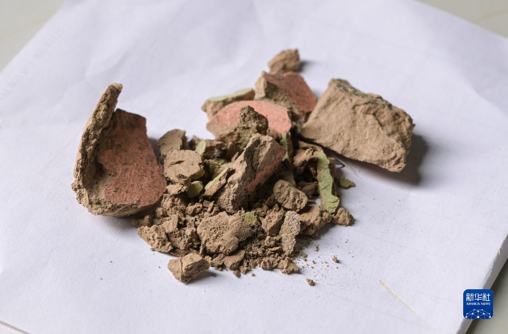 在秦始皇帝陵博物院文物保護部彩色陶俑修復室內的工作臺上擺放著發掘出土的土塊,這些剝落的彩色土塊正等待修復人員采用精湛的技術復原(8月23日攝)。