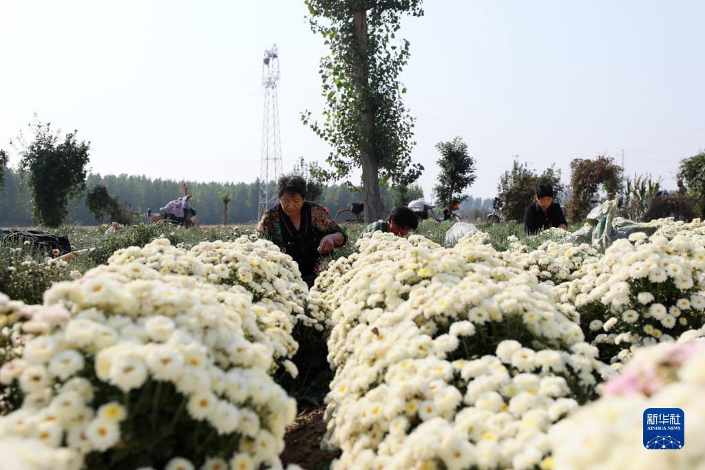 正是收獲菊花的時節,在河北省邢臺市任澤區大屯鄉的菊花種植基地,工人們忙著采摘。